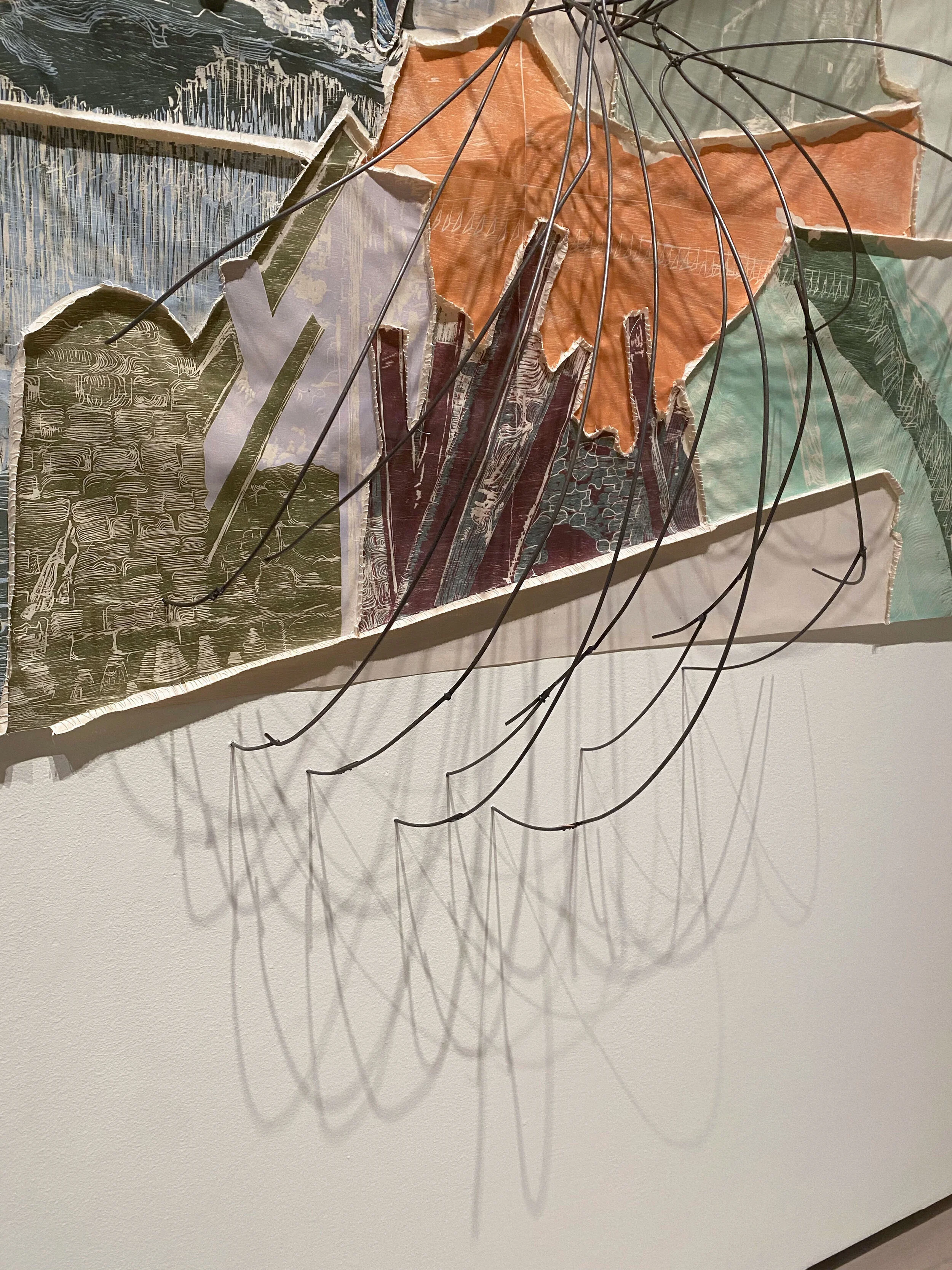 Woodcut prints on Kitakata Paper, hand-stitched with French linen thread, pierced by and held to the wall with metal sculpture
